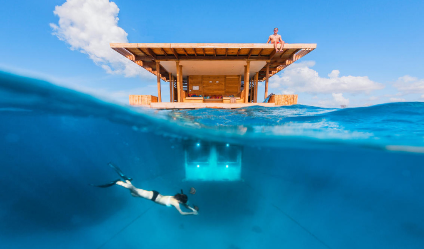 Relax and watch rare fish swim by, from the extreme comfort of your underwater hotel room at the Manta Resort, Zanzibar